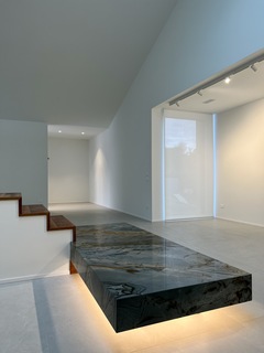 L’ariosa zona living a doppia altezza è dotata di vetrate a tutta altezza affacciate sul giardino di proprietà esclusiva e sulla piscina: uno sfondamento visivo che dall'interno permette un dialogo costante con il paesaggio.